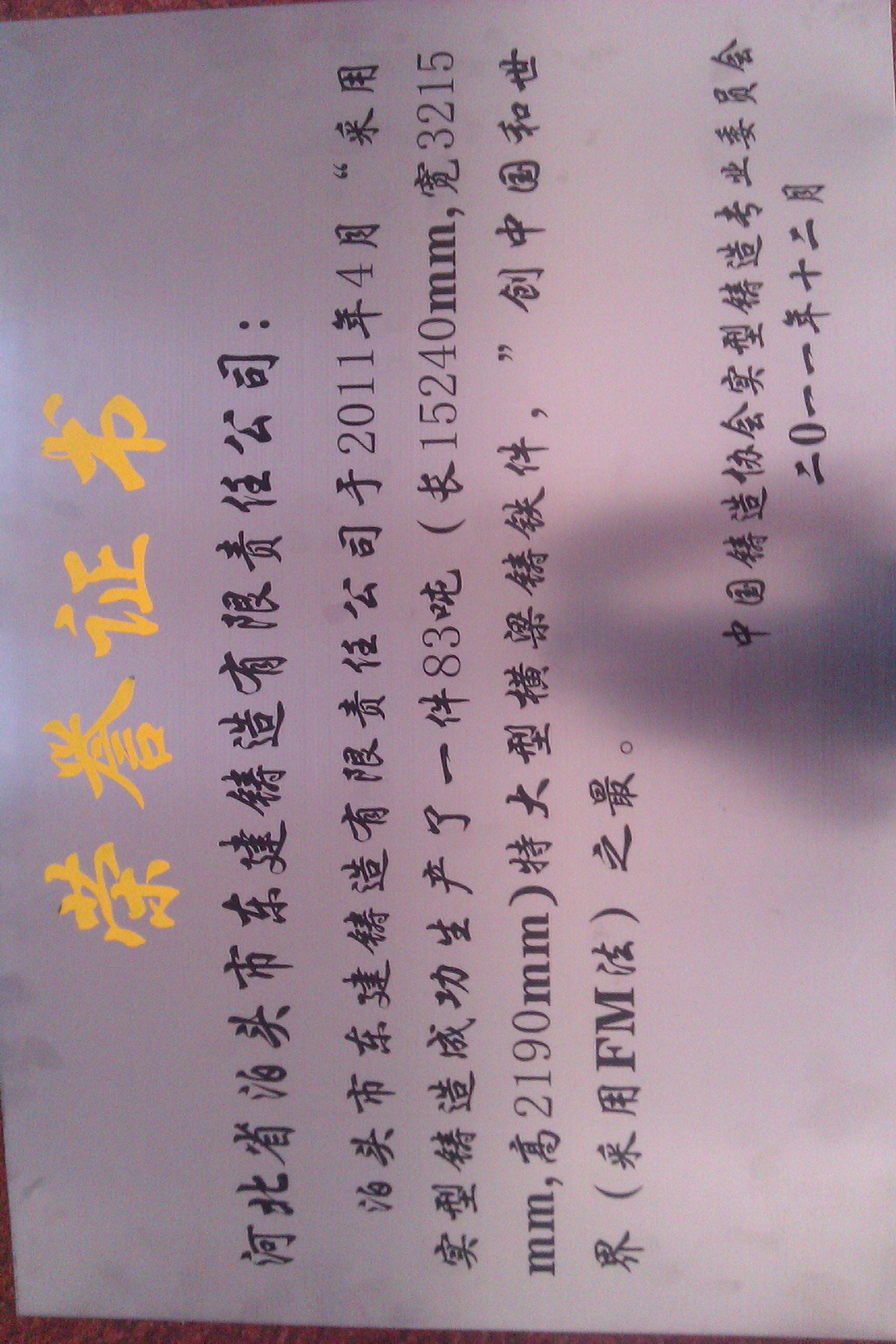 2011 年 12 月 27 日 ,在河北省泊頭市舉行了中國鑄造協(xié)會(huì)實(shí)型鑄造分會(huì) 企業(yè)榮譽(yù)證書頒發(fā)儀式。 近年來實(shí)型(消失模)鑄造了發(fā)展,泊頭市青峰機(jī)械有限公司和泊頭市東建...